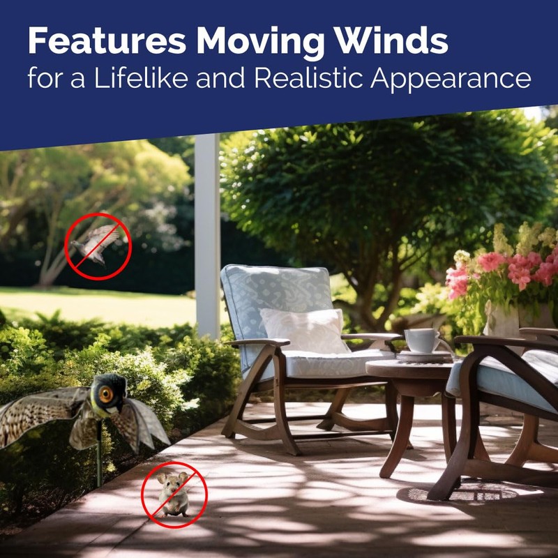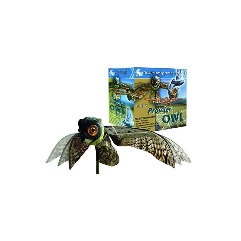 Product DescriptionTransform your space into a haven that is free from bird-related troubles with the Bird-X Prowler Owl, a lifelike replica of the most-feared aerial predator, the Great Horned Owl, which catches and eats nearly everything in its path. The fake owl has accurate plumage, a hunting flight pose, and dynamic wing movement, creating an illusion of flight that intimidates birds and forces them to go away from your spaces. Also, its glassy eyes follow their movements, enhancing its effectiveness. Crafted with durability in mind, the Prowler Owl features a solid plastic resin head, a waterproof non-woven fabric body, and wings supported by flexible cables and sturdy plastic struts. With easy installation, it covers areas up to 6,000 sq. ft., making it suitable for various environments such as parks, gardens, waterfronts, and fields. It is suggested to relocate the fake owl decoy regularly to increase its effectiveness. A reliable and humane solution, this scary fake owl decoy effectively keeps away pigeons, seagulls, gulls, grackles, crows, blackbirds, sparrows, starlings, and more. Elevate your outdoor protection and bid farewell to nuisances, cleanup costs, and health risks with the power of the Prowler Owl Decoy!Dimensions: 44" Wingspan, 23" Head-to-Tail, 6" Head DiameterFrom the ManufacturerTHE BIRD-X DIFFERENCE: Bird-X has been the leading brand of safe and humane bird and pest control products for over 50 years. Based in Chicago, IL, our products are tested by experts over time and are continuously improved upon as new technologies become available. Offering a complete line of unique pest control products, we stand behind the efficacy of our solutions and provide excellent customer support. If you experience any problems with your Bird-X products, please email us through the form found at http://www.bird-x.com/contact-pages-31.php or call our offices at 800.662.5021.
