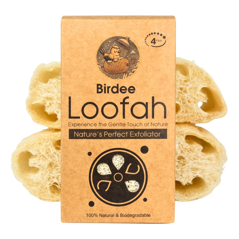 Birdee 100% Plant-Based Loofah Body Wash Sponge - Natural Luffa for Exfoliating and Radiant Skin, Hand-crafted in Vietnam, Pack of 4