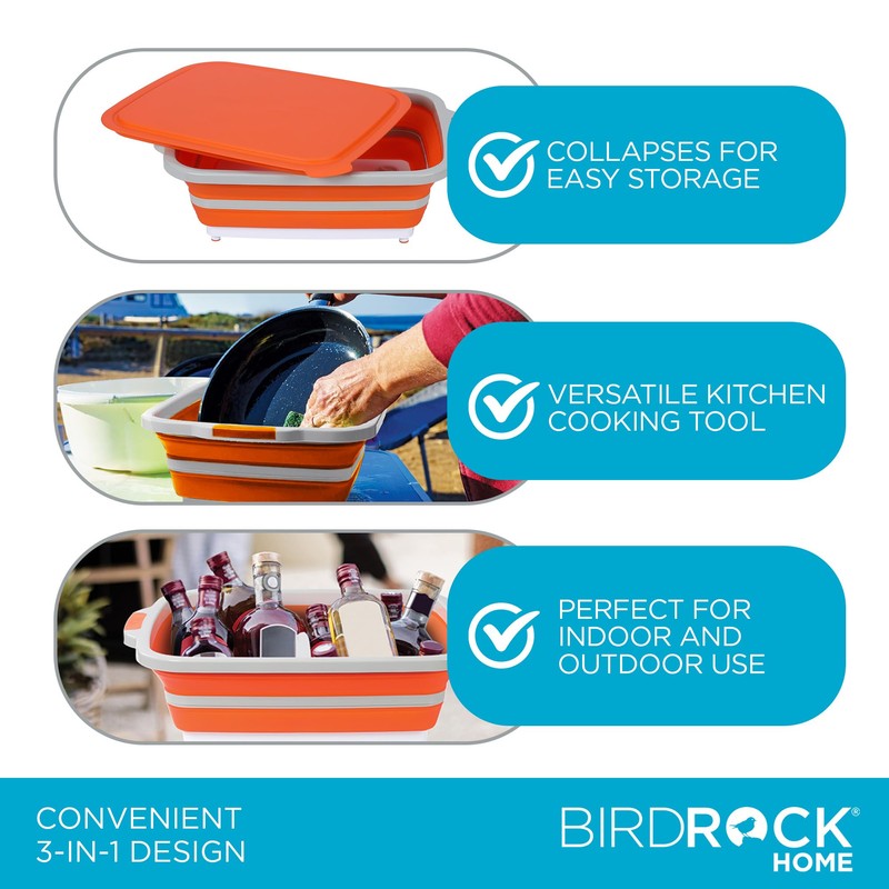 BIRDROCK HOME Collapsible XL BBQ Prep Tub w/Cutting Board, Multi-Function Grill Caddy w/Colander & Lid, Portable Silicone Dish Bowl for Picnic, Tailgate, Camping - Orange