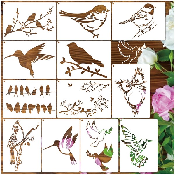 Birds Stencils for Painting on Wood Crafts Reusable Hummingbird on Tree Branch Stencil Art Owl Paint Stencil on Wall Canvas Pattern Paint Stencils for Card Making Fabric Shirt Furniture (12 Bird A6)