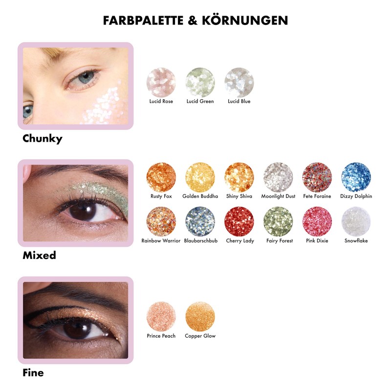 - SKIN FRIENDLY AND GENTLE Thanks to softer edges, the glitter is particularly gentle on the skin and does not cause irritation. It lasts for hours, easily applied with brush and primer and removes effortlessly with soap and water