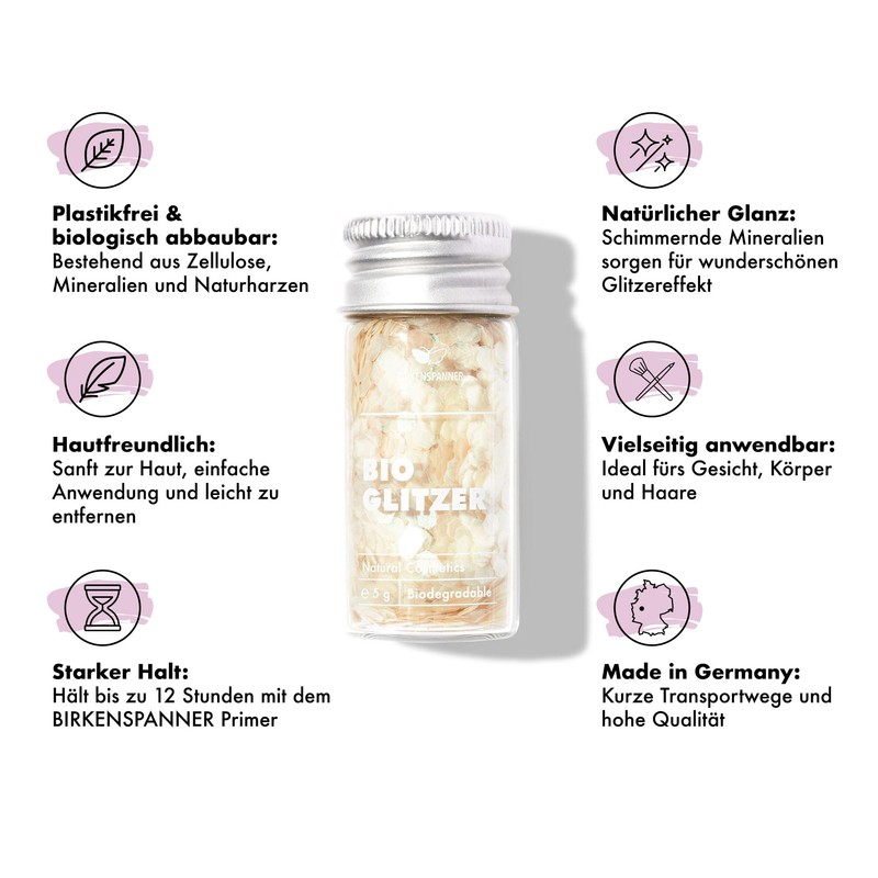 - Made in Germany: our glitter is produced in Germany, which avoids long transport routes. The sustainable cellulose comes from European eucalyptus plantations and the colours from natural minerals