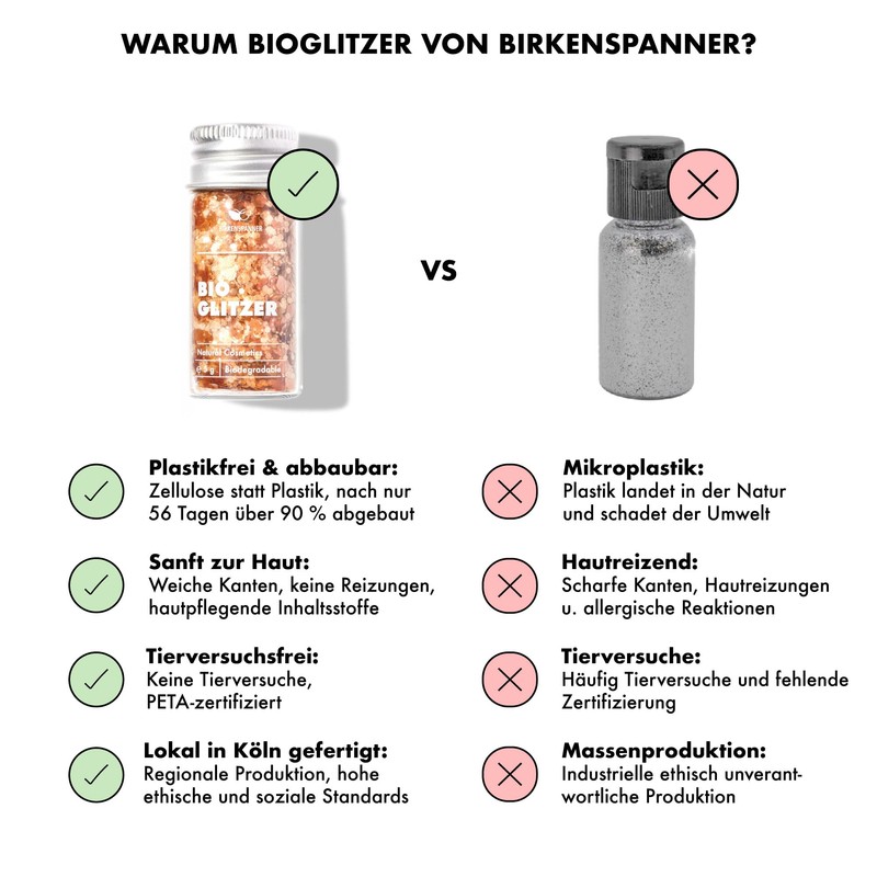 - Made in Germany: our glitter is produced in Germany, which avoids long transport routes. The sustainable cellulose comes from European eucalyptus plantations and the colours from natural minerals