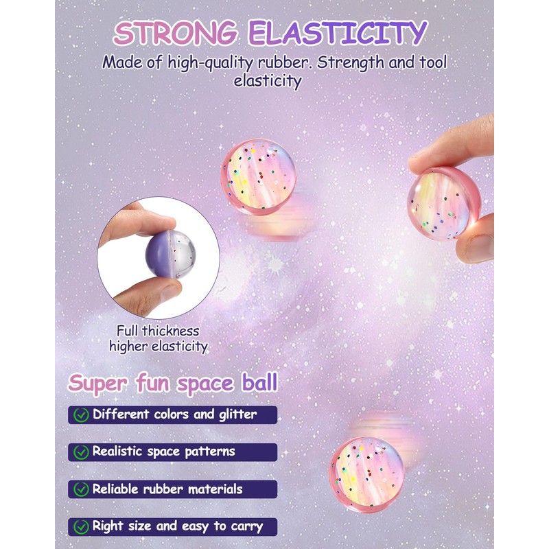 - Sparkling star bouncy balls: bouncing balls in random colours. Bright colours. There are many sparkling dots in a single bouncy ball that makes the whole ball sparkle, a bouncing ball with beautiful images and designs of planets and space. The bouncy ball bounces well and looks good. Kids will have so much fun with these birthday gifts for kids.
