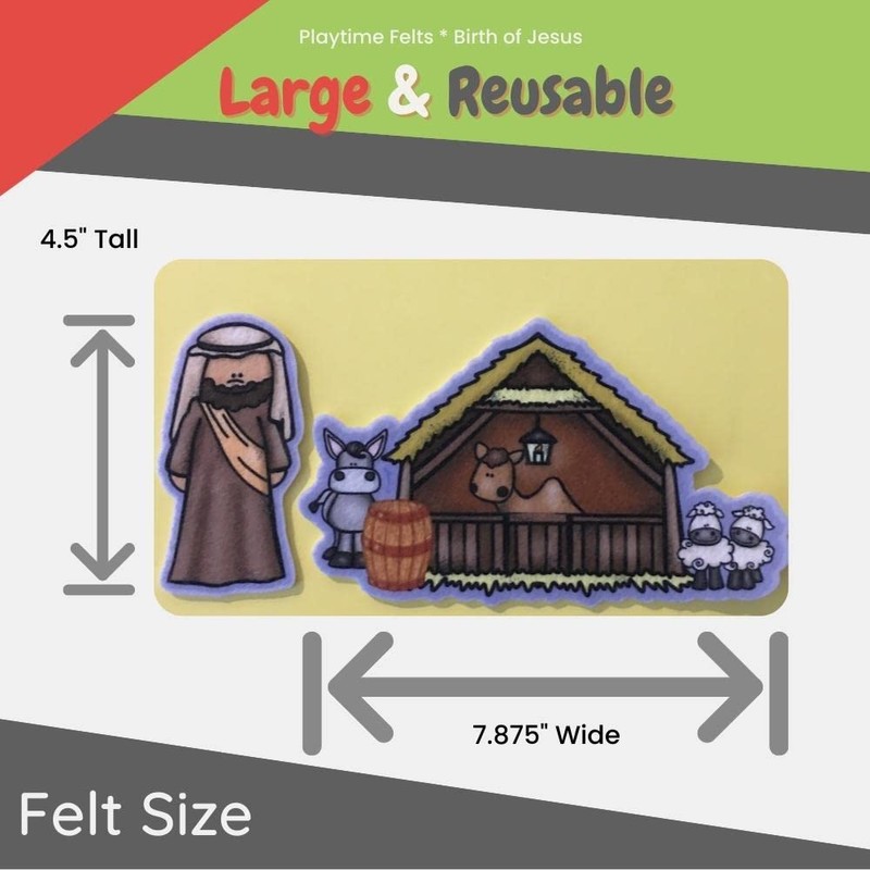 • FELT STORY SET INCLUDES: 15 Big, Bright, & Bold Felt Images - Shepherds, Wisemen, Three Gifts, Large Stable with Animals, Joseph, Two Mary's, Baby Jesus, Baby in Manger, Two Angels and a Shooting Star. Also comes with Fun Felt Story Script.
