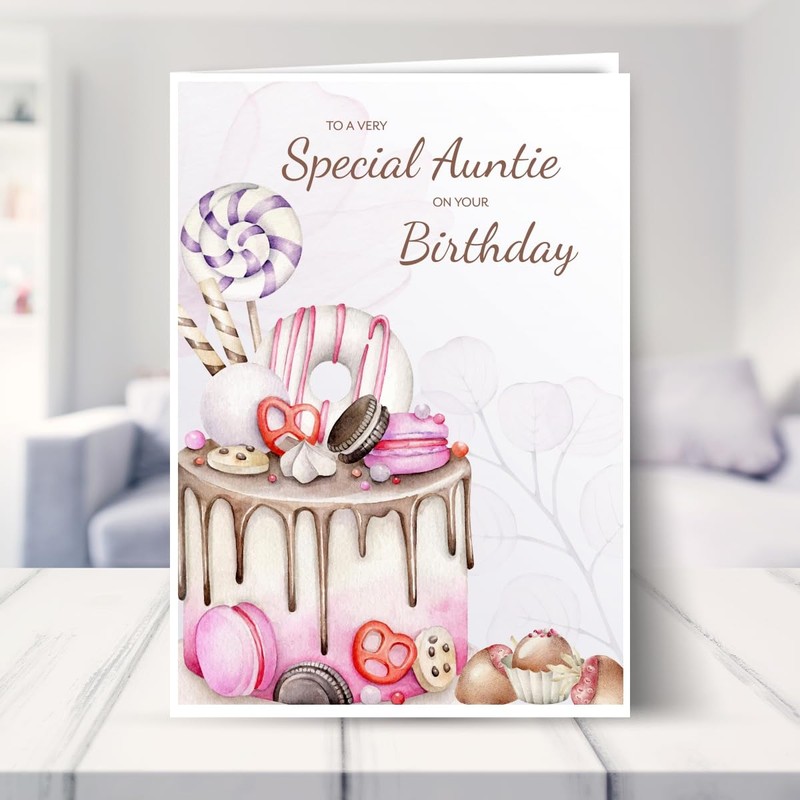 - This nice birthday card for auntie is colourful and friendly. Specially designed for women with the following text on the front: To a very special auntie on your birthday. These lovely words are displayed on the top of the card along with large decorated birthday cake. As a bday greetings card there is also no mention of a specific age so the card can be given from a niece or nephew for any year.