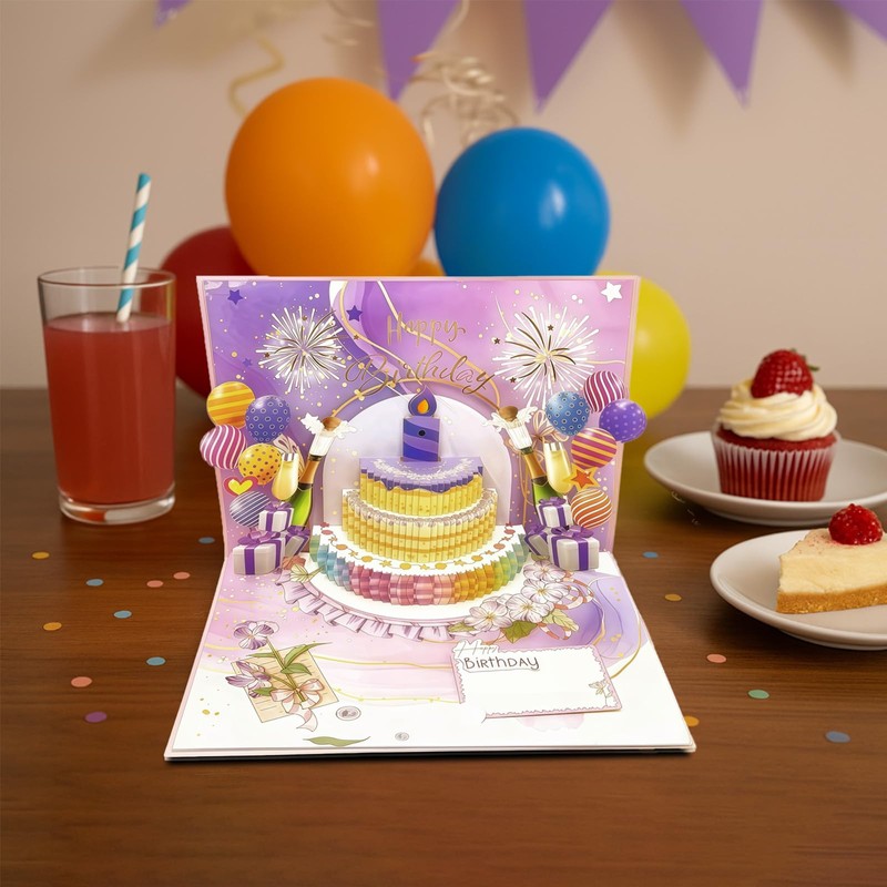 • 🎉Stunning Pop Up Design – Open the card to reveal a 3D birthday cake with colorful fireworks that light up in sync with the “Happy Birthday” song, creating a magical celebration atmosphere.