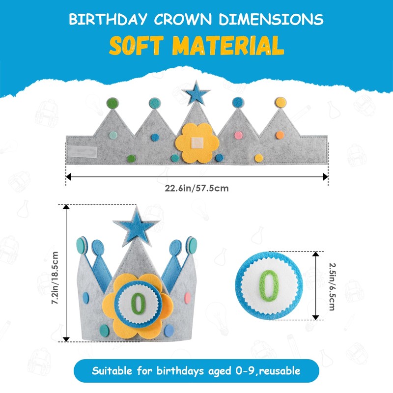 - 【Premium Soft Material】 Made of 4mm thick double-layer felt, gentle for baby skin. Ideal Birthday Crown Kids accessory, durable and reusable for multiple birthdays