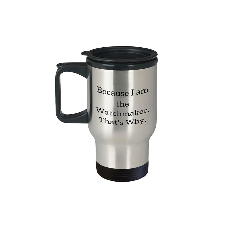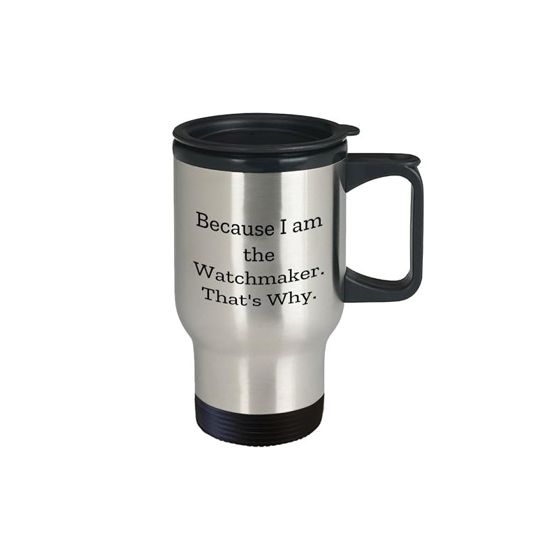 - This travel mug makes a unique birthday gift for watchmakers, featuring the humorous phrase 'Because I am the Watchmaker. That's Why.' that will surely bring joy to their day.