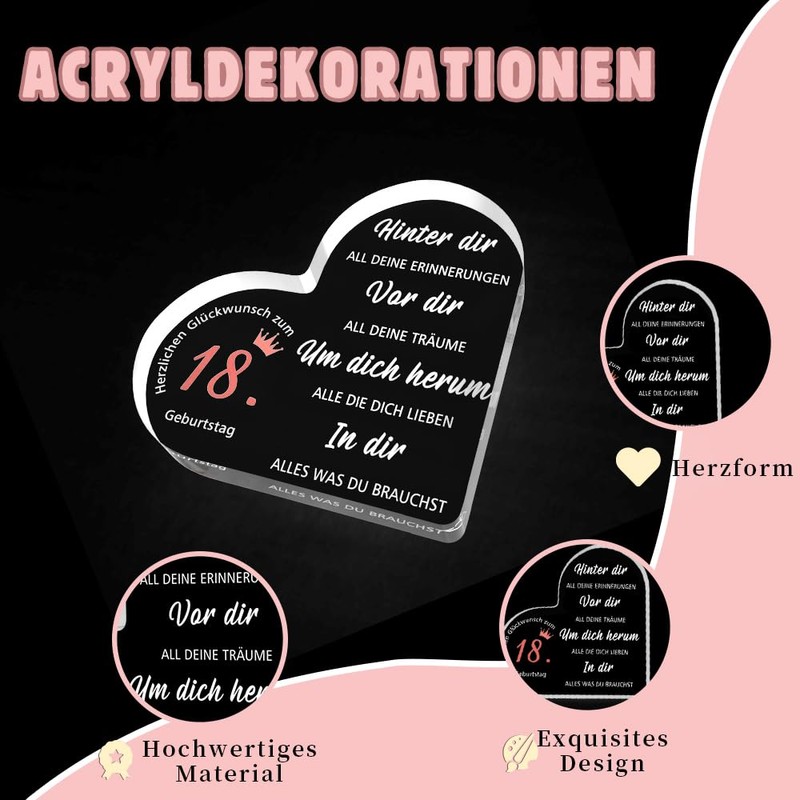 - 18th Birthday Decorations: The 18th Year is very important for everyone, it has left memories and will herald a better future. Acrylic 18th Birthday Decorations with engraved text to convey your blessings and love to the 18 year old. Gift for 18th birthday girl, 18th birthday girl gift, gifts 18th birthday girl, gifts for 18 girls, gift for 18 years girls, gift 18th birthday girl, 18th birthday girl gift
