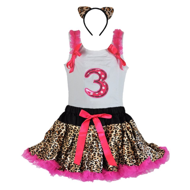 - Celebrate birthday in style with this captivating and adorable dress set. Set included white tank top fuchsia sequin trim age number. Leopard tutu with black ruffle trim and a matching leopard headband. These 3 pieces makes the most attractive birthday costumes set.