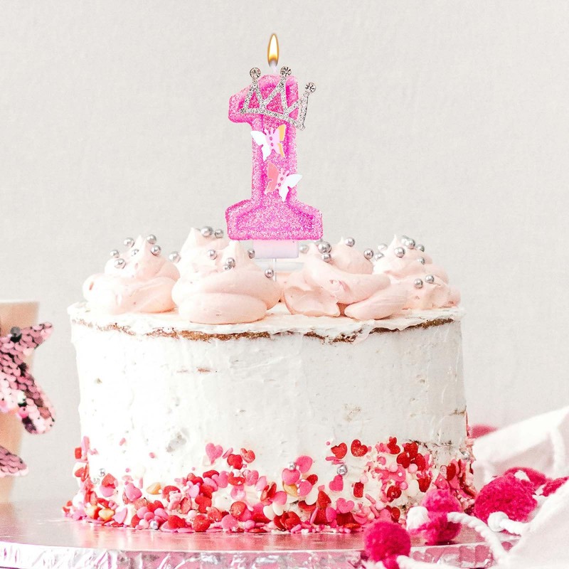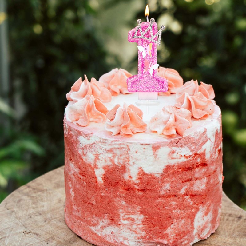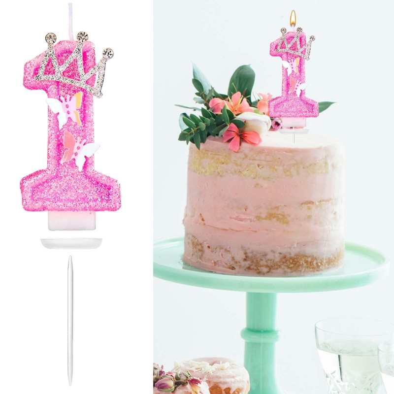Birthday Number Candles, 7.3 cm Pink Glitter Number Candles with Butterfly and Rhinestone Crown, Birthday Number Candles, Perfect Birthday and Anniversary Decoration (Number 1)