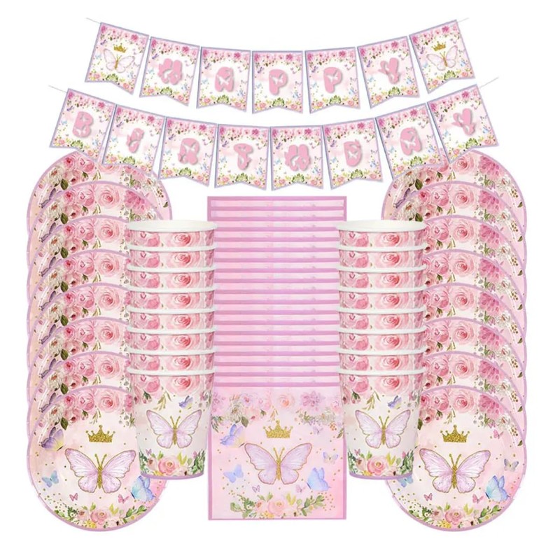 Birthday Party Supplies Tableware Set With Plates, Cups, Napkins, Tablecloth, Banner & Cupcake Pink Theme