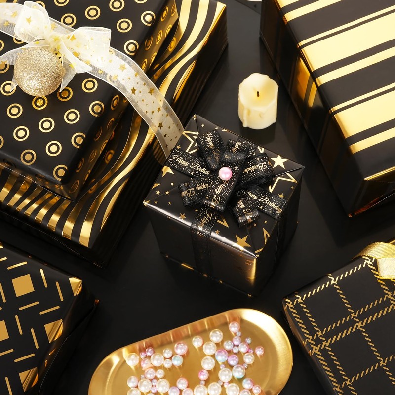 - Black Wrapping Paper Set: This gift wrapping paper set comes with 6 sheets of black gold foil wrapping paper in 6 designs, 1 sheet sticker (10PCS) and 2 rolls of gold and silver ribbon (2M per roll). Shiny wrapping paper with enough accessories to make your gifts luxury and makes a statement.