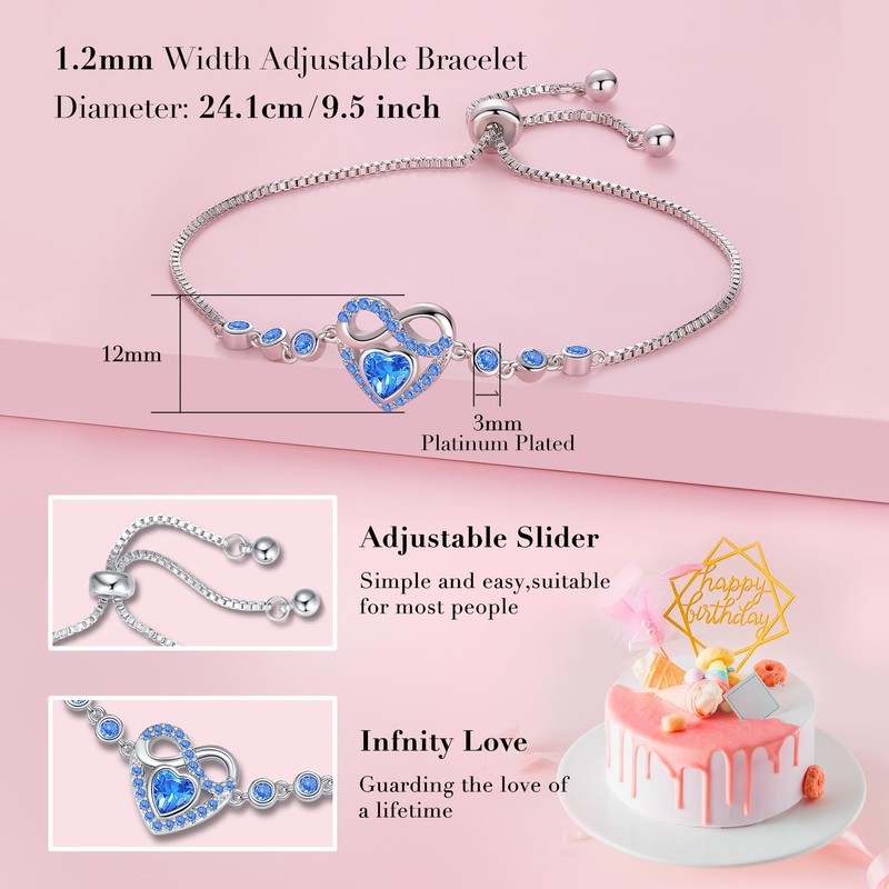 - Unique Design: This adjustable birthstone heart bracelet beautifully combines classic and modern elements. The infinity heart-shaped pendant symbolizes eternal love and affection, making it a perfect accessory to express your personality and style. Whether for everyday wear or special occasions, this fashion silver bracelets adds a lovely touch to any outfit.