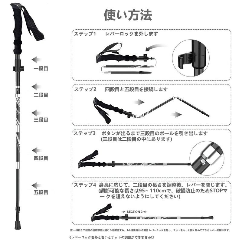 - 【5段伸縮式・長さ調節可能】ストックの連結部はレバー式ロックを使用、適した長さに簡単に調整できます。ポールの高さを110㎝から135㎝まで調整でき、自分に合った長さを調節できます。折り畳み時は約35㎝になるので、コンパクトに持ち運びが便利です。