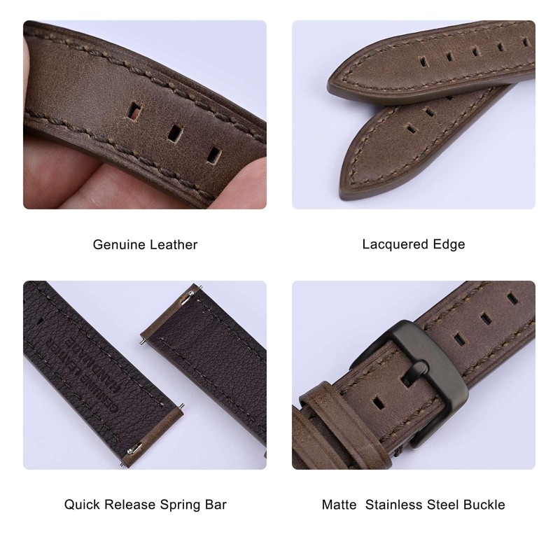 - GENUINE LEATHER: Made of cowhide leather, the surface layer is treated with oil dyeing, which ensures a shiny appearance and durability. This watch strap is soft and comfortable, has a solid stainless steel buckle and is suitable for various formal and casual occasions
