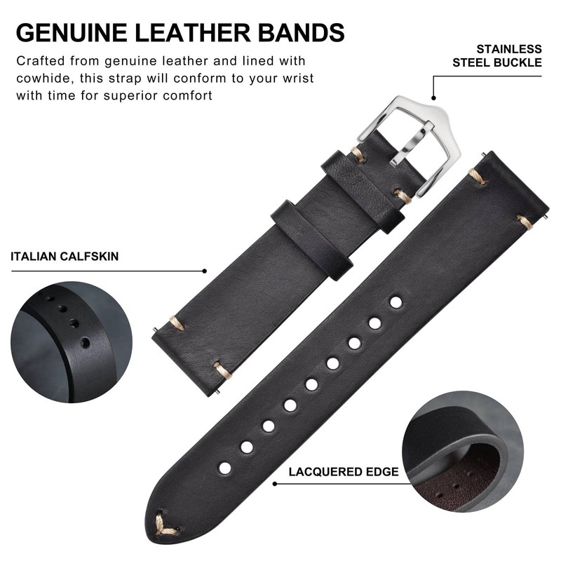 BISONSTRAP Men's Watch Straps, Hand-Stitched LeatherWatch Replacement Bands, Quick Release, 20mm, Black with Silver Buckle