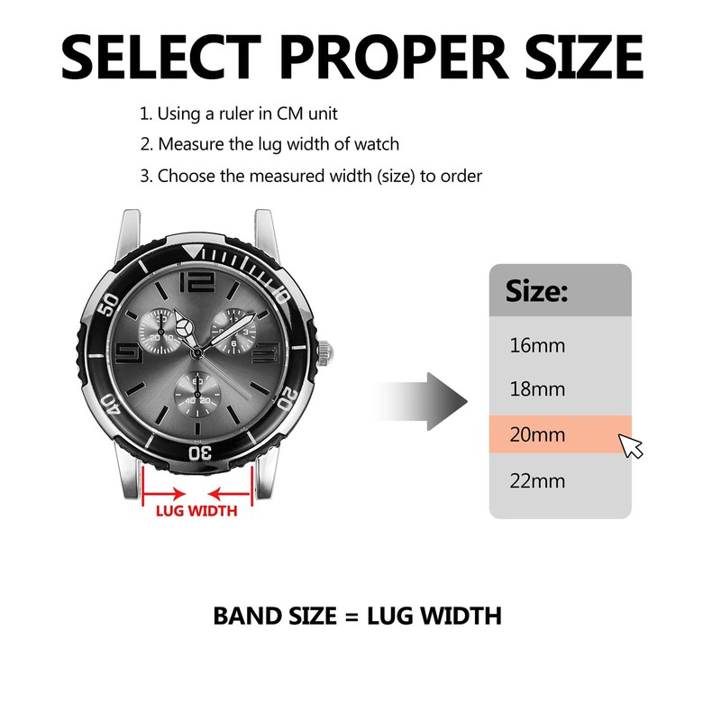 - Size Selection: Available in 18mm 19mm 20mm and 22mm, please accurately measure your watch lug width and choose the right size. Size = Watch Lug Width