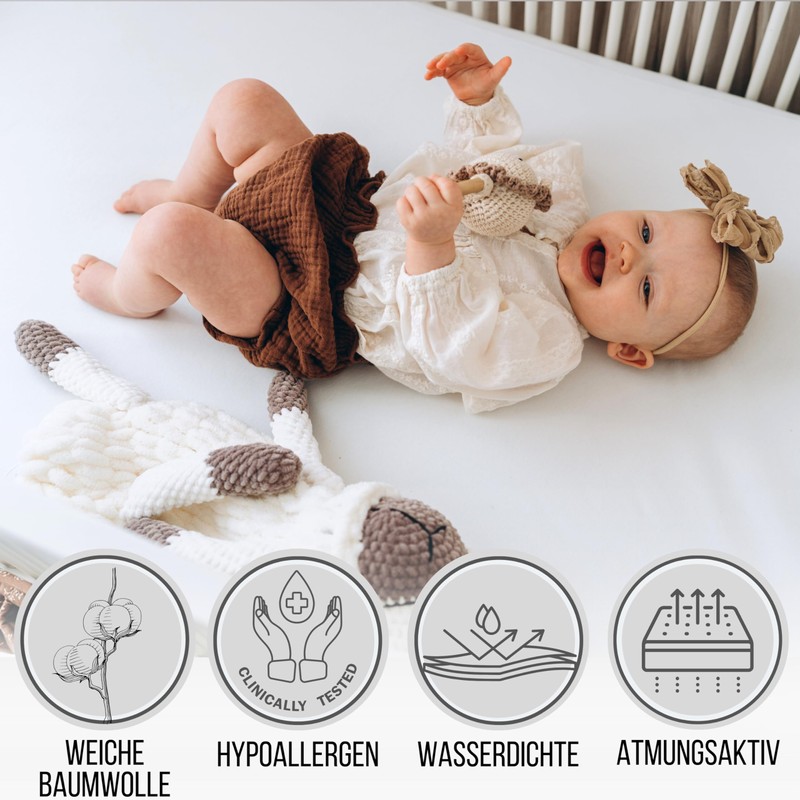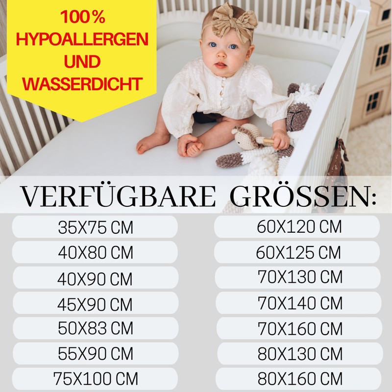 - Waterproof: Under the jersey layer there is a waterproof polyurethane membrane. Thanks to this invention, we can protect baby's sensitive skin from irritation while not worrying about the mattress. The ability to wash them at 60°C in the washing machine helps with adequate disinfection and prevents the growth of bacteria and mites.