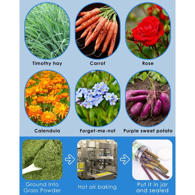 - 6 in 1 Chewing Treats: 6 flavors of the mixed guinea pig toys set includes timothy hay, carrot, rose, purple sweet potato, calendula and forget-me-not to provide daily energy. Quality and intriguing select of bunny toys and treats set for your small friends!