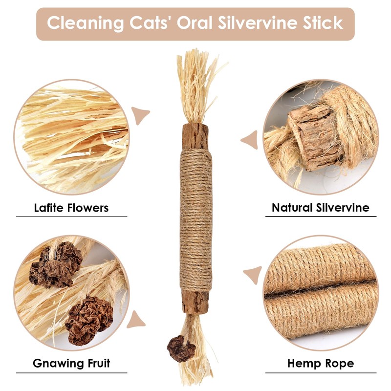 - 100% Natural Cat Chew Toy: 10pcs silvervine sticks for cats are made from FSC-Certified wood natural silvervine ( also called Matatabi) plant material, Lafite flowers, feather and polyline filling fruit gnawing fruit, hemp rope, which is safe and healthy, no additives or preservatives