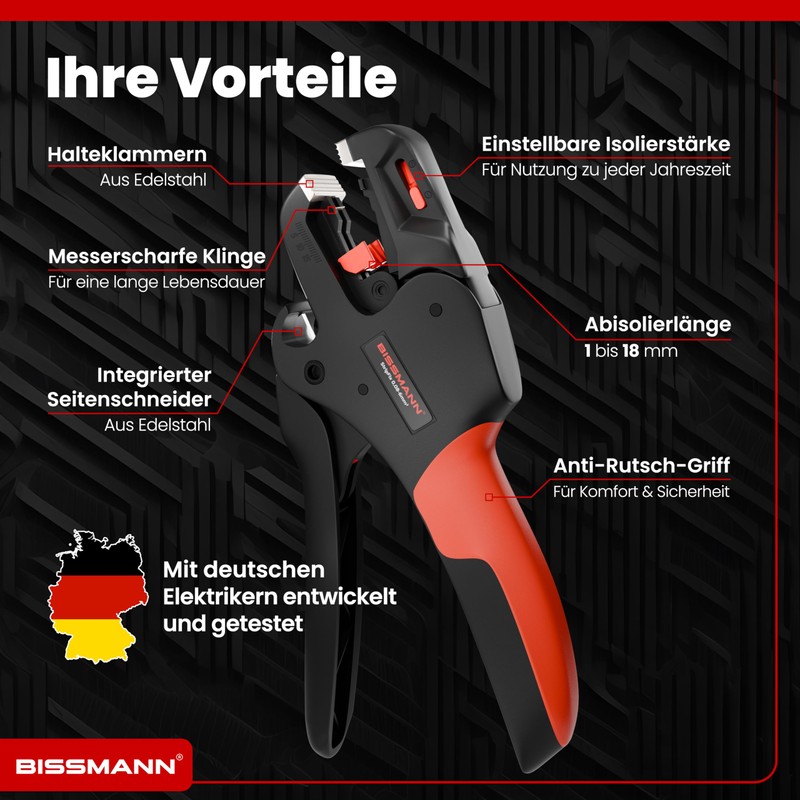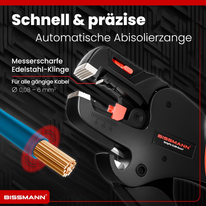 Bissmann® Automatic Wire Stripper | Fast & Precise Stripping | Stainless Steel Blade - Includes Side Cutters | For All Standard Cables 0.08 to 6 mm² | Stripping Tool | Cable Stripper