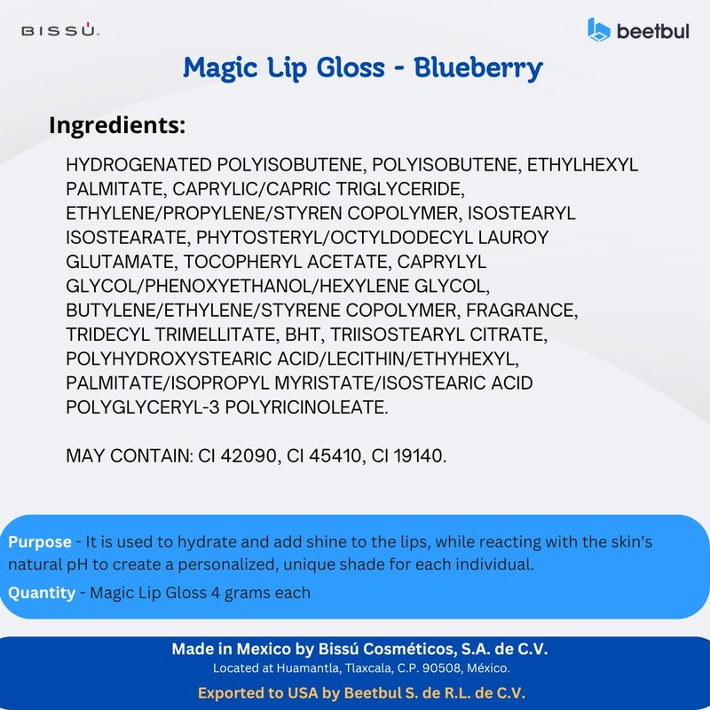 Bissú Magic Lip Gloss, 6 Fruity Scents, Moisturizing pH Reactive Gloss, with drop-shaped applicator and large size (01 Blueberry, 4 Grams)
