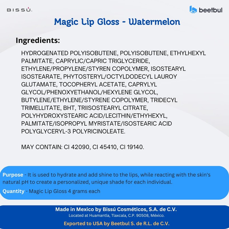- pH Reactive Formula: Bissú Magic Lip Gloss adapts to your unique pH level, creating a personalized, subtle pink tint that enhances your natural lip color.