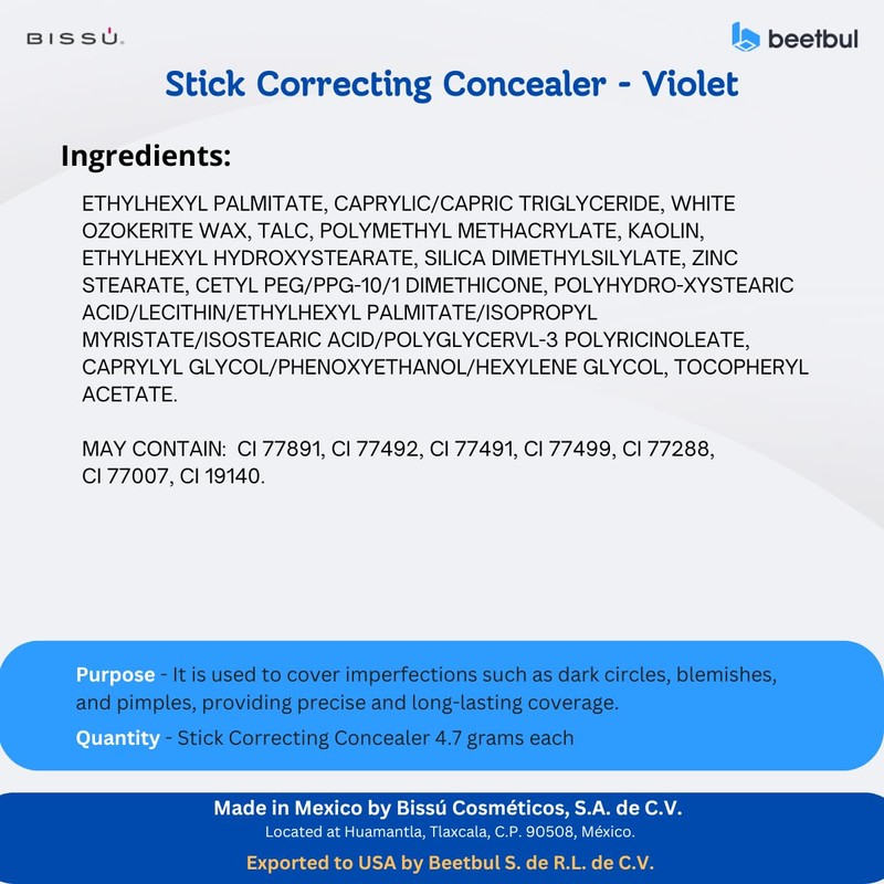 Bissú Stick Correcting Concealer - 15 Versatil Shades, Natural Finish, Contouring, Highlighting, Easy Application, 4,7 grms (Violet, Stick)