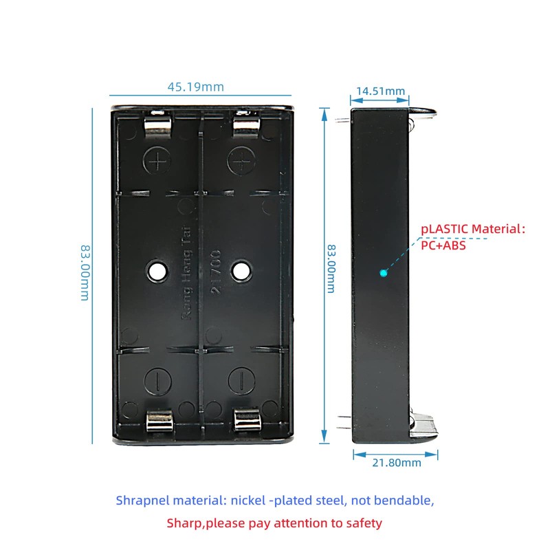 - Importante: es adecuado para baterías de litio cilíndricas de cabeza plana 21700, con una longitud de 70 mm y un diámetro de 21 mm. La batería debe instalarse desde el polo positivo, luego el polo negativo. Para desmontar la batería, debe desmontarse del polo negativo, y está prohibido desmontar del polo positivo de la batería. De lo contrario, existe el riesgo de cortocircuito