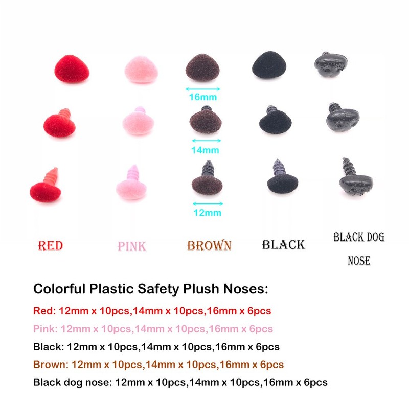 - Item includes: colourful safety noses (pink, red, brown, black, dog nose). Each colour: 12 mm x 10 pieces, 14 mm x 10 pieces, 16 mm x 6 pieces.
