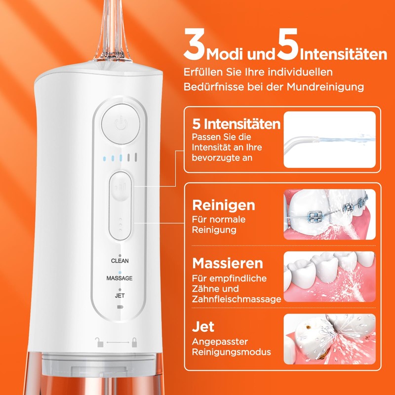 - 3 Zahnseide-Modi: Jet - Zur flexiblen Steuerung des Wasserflusses, um eine umfassendere und präzisere Mundreinigung zu erreichen, insbesondere in schwer erreichbaren Bereichen. Clean - Zum Entfernen kleinerer Partikel zwischen den Zähnen. Massage - Zur gründlichen Reinigung Ihrer Zähne und zur Stimulierung und Massage des Zahnfleischs