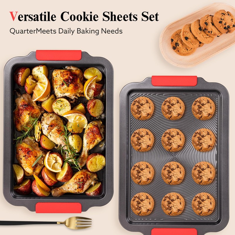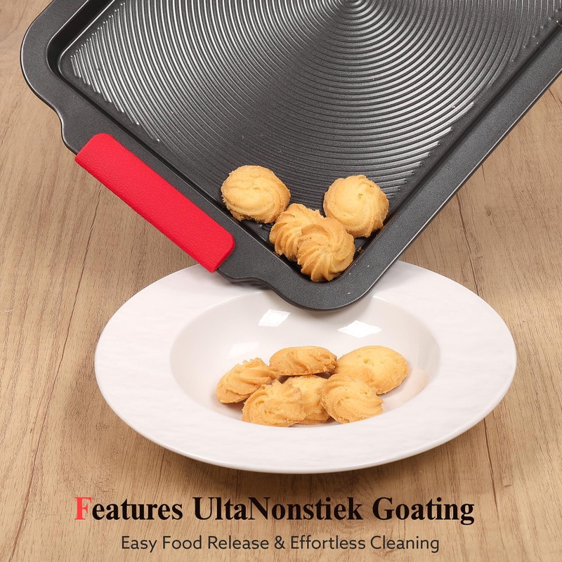 - 【Easy-grip Handles】:The red silicone grips provide a comfortable, secure hold for easier handling in and out of the oven, making handling the pans easier and safer while adding a stylish and practical touch.