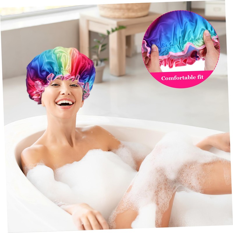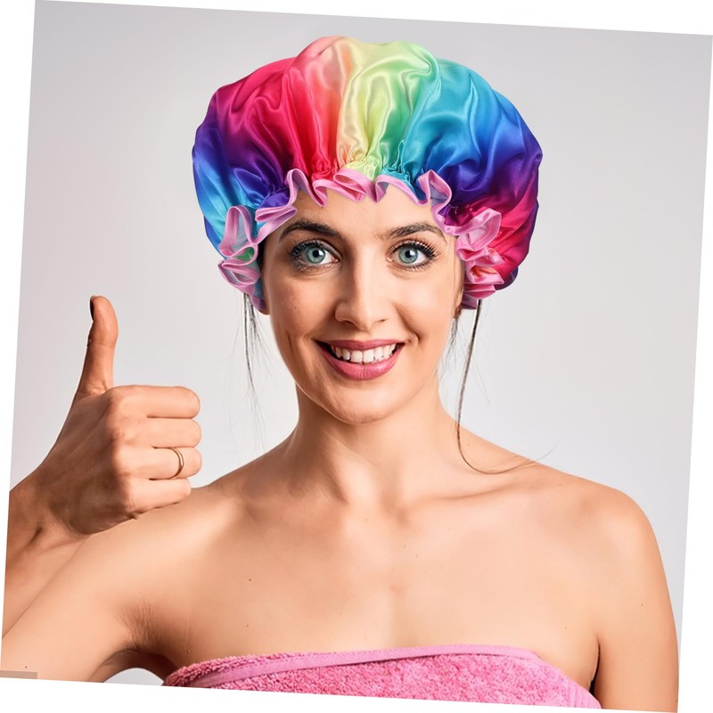 Hair Shower Cap The elastic shower cap allows a tight and comfortable fit for all head sizes, making it suitable for both men and women.Womens Shower Caps The vibrant rainbow colors add a fun touch to your daily routine.Shower Hat Our stylish shower cap is designed to keep your hair dry and protected while you shower
