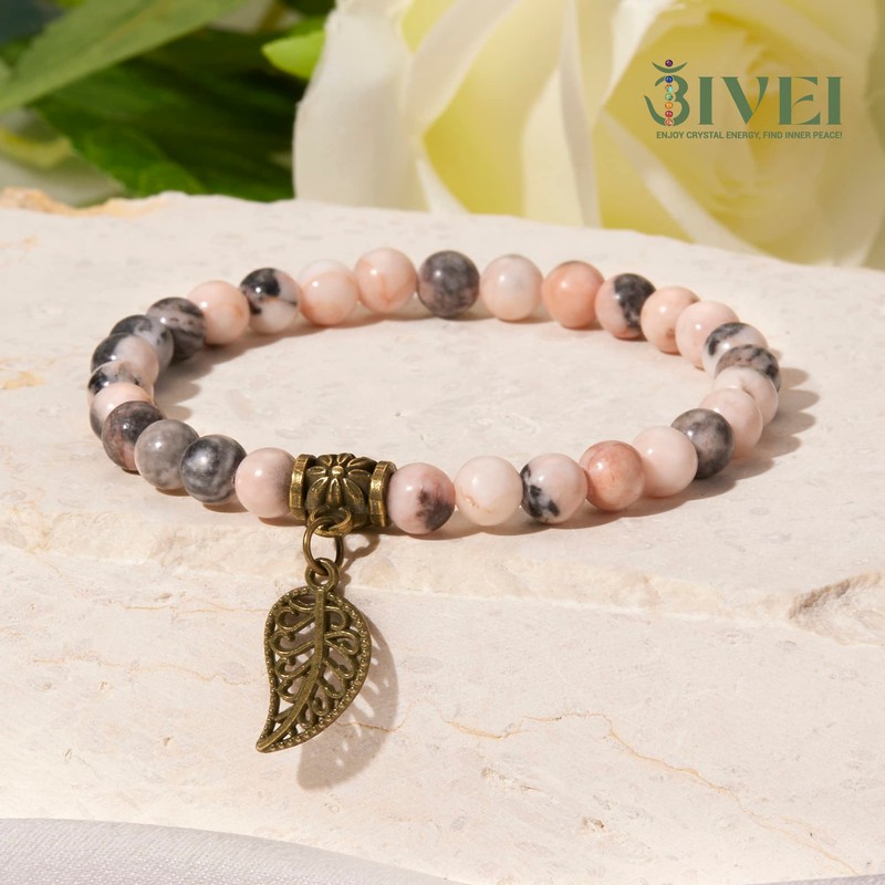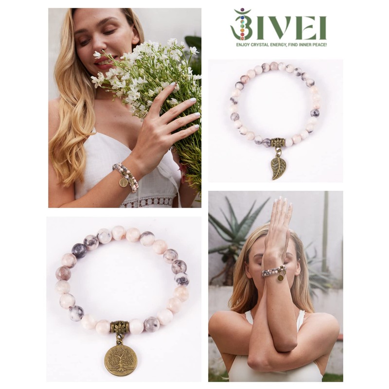 Bivei Rose Quartz Beaded Bracelets Heart Chakra Crystal Healing Tree of Life and Leaf Charm Bracelet Natural Pink Zebra Jasper Semi-Precious Gemstone Stretch Bracelets Set for Women Love Relationship