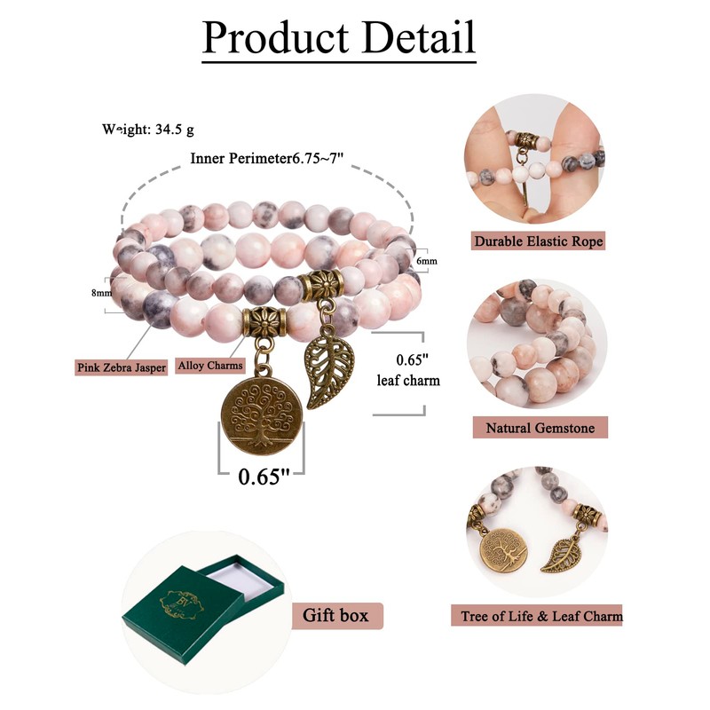 - 【Product description】Total Length of beaded bracelet: about 6.7". Beads: Life tree charm bracelet: 8mm. Leaf charm bracelet:6mm. The item weights about 33-37 grams for each healing bracelet,light weight and comfortable for wearing. Perfect for women.
