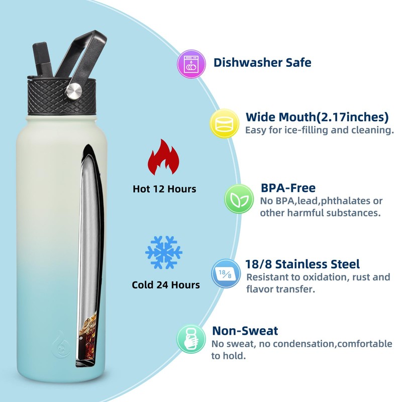 BJPKPK Insulated Water Bottles with Straw Lid, 40oz Large Water Bottle, Stainless Steel Metal Water Bottle with 3 Lids, Reusable Thermos Bottle, Cold & Hot Water Bottle for Sports, Gym-Mint