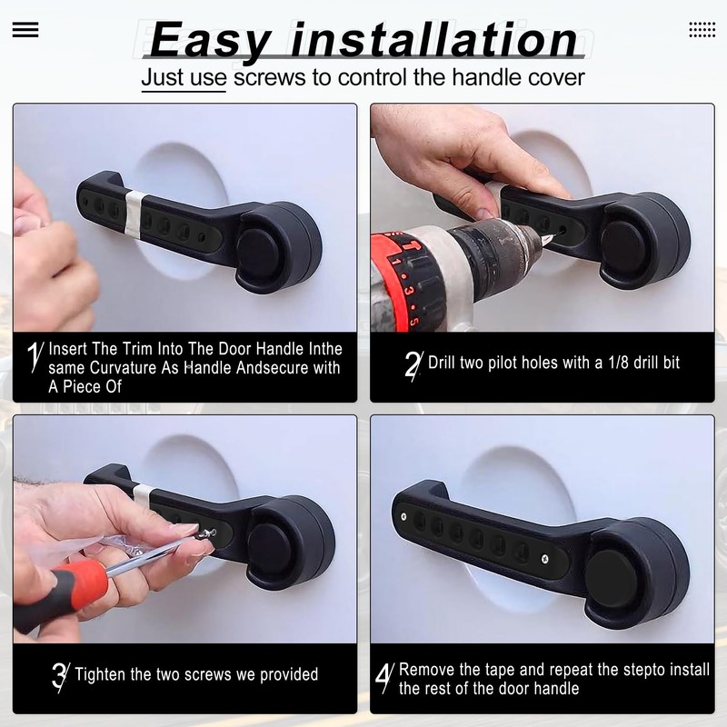 - Easy Install:Easy installation with precisio holes, just control handle covers with screws.The push button cover back with self-adhesive tape, easily and firmly stick it on and no damage to your car.