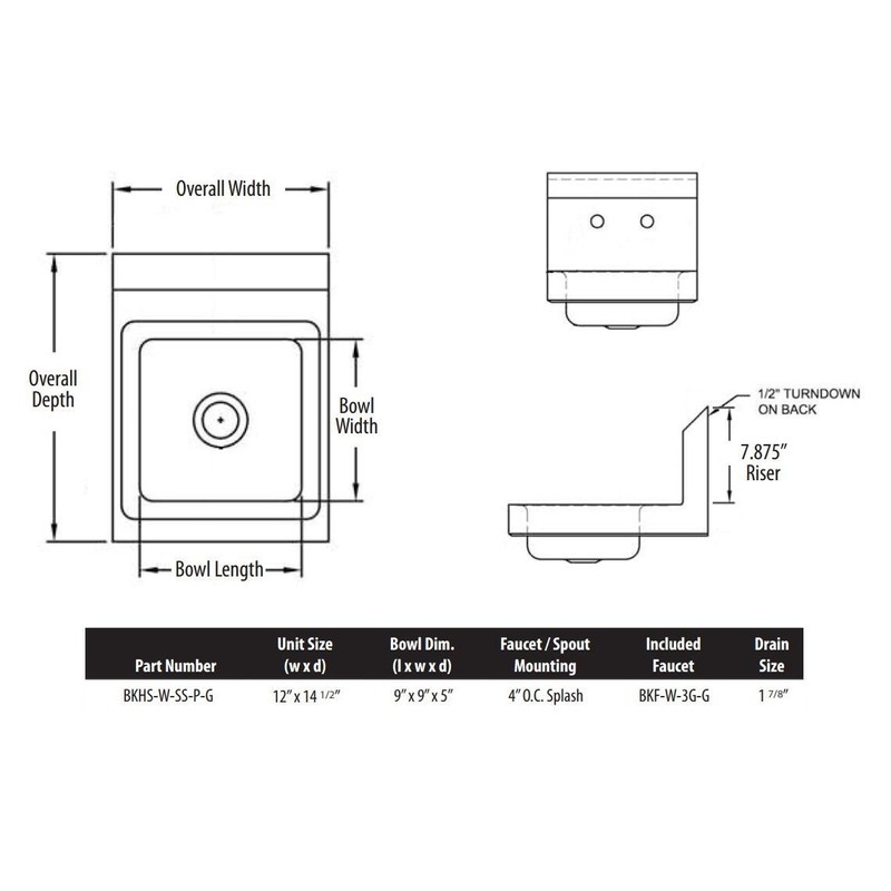 This commercial quality hand sink is ideal for busy restaurant and commercial settings. This wall mounted sink is a space saving design and measures 12 inches wide and 14. 5 inches deep. The sink bowl measures 9 inches long, 9 inches wide and 5 inches deep. This sink is made from 304 stainless steel and has a 4 inch on center splash mount faucet. The drain opening is 1 7/8 inches and a basket drain is included. Mounting bracket is also included. This hand sink is NSF certified. Hand sink carries a one (1) year Manufacturer's against any defects. Offered by BK Resources: a leading supplier of Stainless Steel products, plumbing supplies, commercial gas hoses, and refrigeration. BK Resources strives to develop products that are built to last, save time, increase efficiency and offer value to the end user. BK Resources products can be found in leading restaurants, bars and night clubs, universities, stadiums and food trucks nationwide.