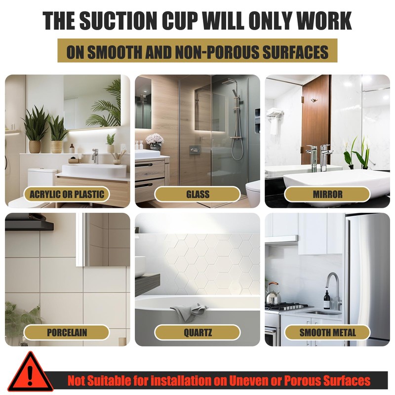- 【Only On Smooth Surface】Must know information before installation.The shower suction hooks are ONLY suitable for non-porous and smooth surfaces such as such as glass,mirror,tile,marble,metal.Not Suitable for uneven,rough,textured or painted surfaces