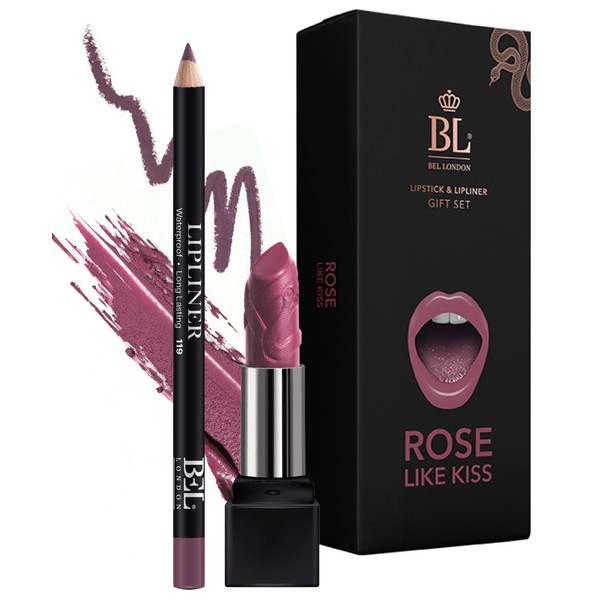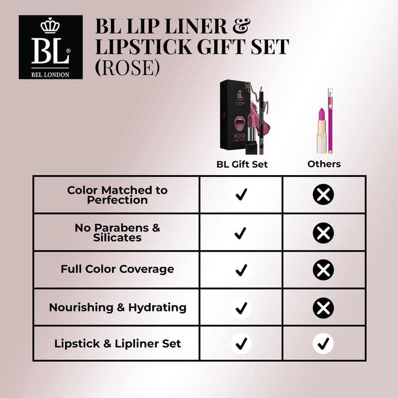BL Color Matched Lip Liner & Lipstick Set (Rose) - Full-Coverage Argan Long Lasting Lipstick and Lip Liner Set With Natural Oils for Nourishment, Hydration, & Protection - Chemical-Free