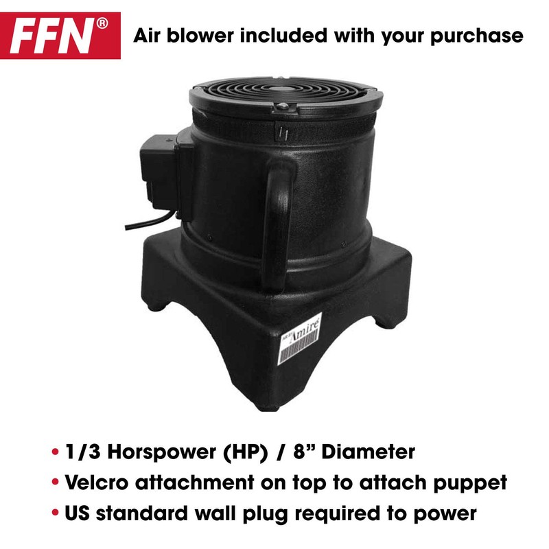 1 - 1/3 HP air blower to power the tube manThis air powered tube requires an 8'' diameter 1/3 horsepower air blower. The puppet will stand 8 feet tall once attached to our air blower.