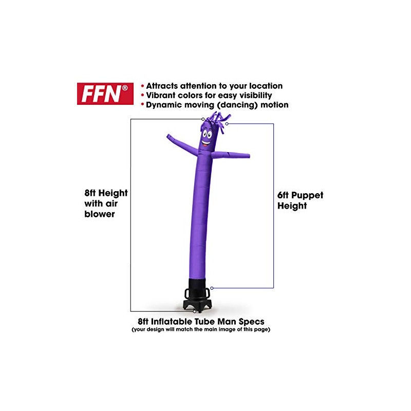 Use these professionally designed air powered tube men from Feather Flag Nation to bring attention to your business, booth, event, trade show, sporting event, etc. These tube men start creating instant impressions, which means you start getting more traffic right away. If used outdoors for special events or sales a couple of times a week, the air puppet will easily last many years. The 8'' diameter of the dancer allows it to attach to most 8'' diameter 1/3 horsepower air blowers.