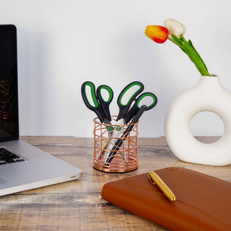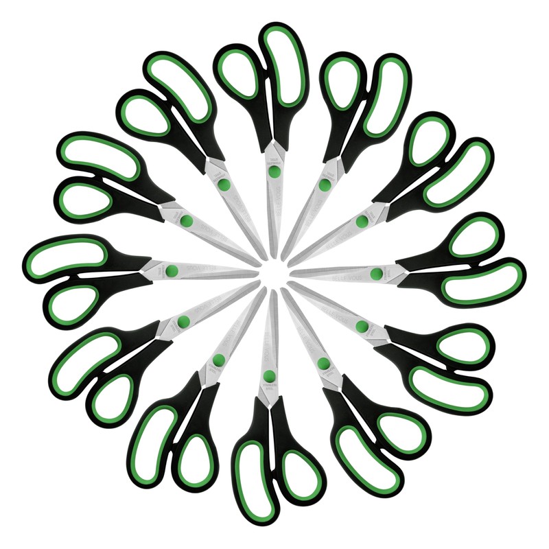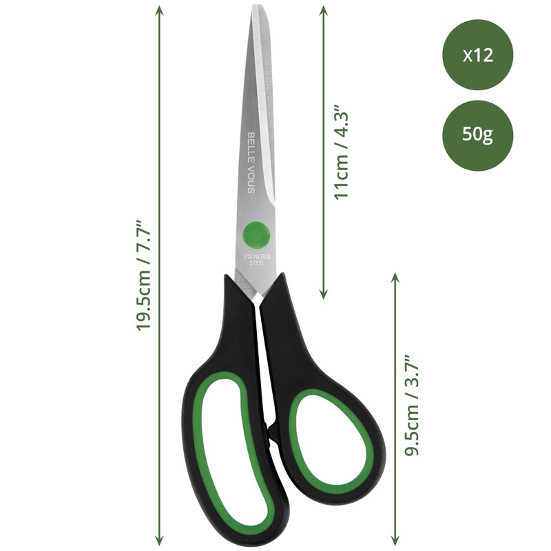 This set of office and stationery accessories includes 12 scissors for adults that are suitable for both right and left handed users. Each scissors is 19.5cm long, with blades of 11cm, and weighs only 50g. The handle of each scissors is made of soft, black and green rubber. Our professional scissors are perfect for cutting paper, cardboard, packaging, cards, hessian, tape, crafts and everything you need for scrapbooking. They are very practical for the office, school, university or home.
