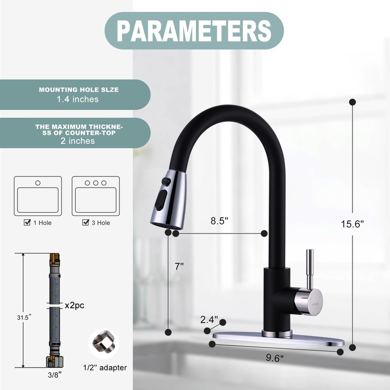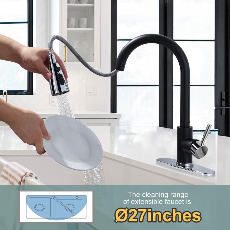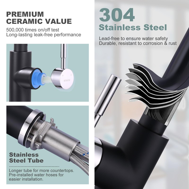 - 304 Stainless Steel Faucet: No rust, corrosion resistance, and built to last. The bold black and chrome finish, will absolutely be an eye-catching highlight for the kitchen