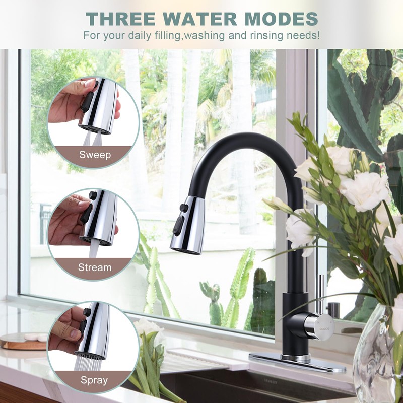 - 3 Water Modes: Stream, Spray and Sweep modes bring awesome convenience for filling, washing and rinsing. Especially the powerful dual sweep mode makes cleaning the sink debris a breeze! Thickened rocker switch for smoother switching and less likely to get stuck
