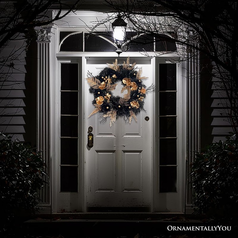 Hanging a black and gold wreath can symbolize strength, mystery, and abundance, making it a captivating conversation piece that adds a touch of luxury and intrigue to any entrance.