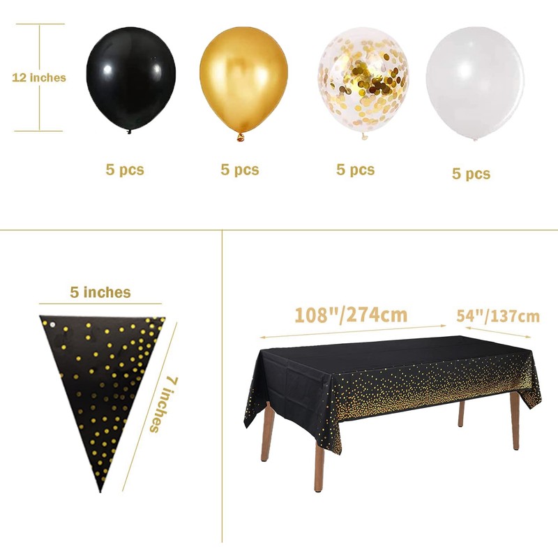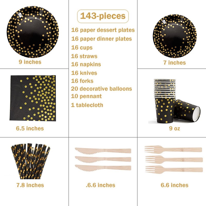 - Fashionable black design with shiny gold dots for a black and gold theme party, which gives your party an elegant and high-quality taste and makes your party unforgettable and impressive!