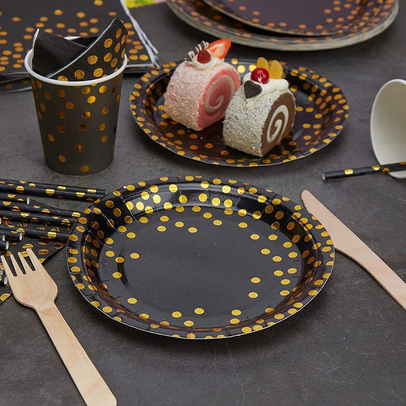 Black and Gold Party Tableware, Party Tableware Set, Gold Foil Polka Dot Birthday Party Tableware for Parties, Weddings, Anniversaries, Birthdays (16 Servings)